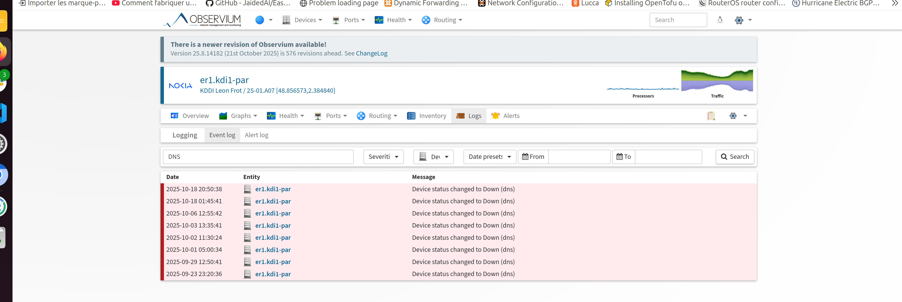 We often have occurences of alerts from specific Observium pollers. It happens randomly, it does not happen on a specific time range. Though, there is no problem shown on the devices that concerned by the alerts. You may find attached a screenshot containing the logs of an impacted device. The logs shows "dns", so we also made sure that our dns resolvers and dns authoritative servers are in working order.